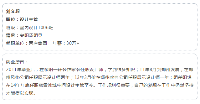 作为职业设计教育,河南西儒教育(设计学院)的就业优势尤为明显 。一方面学校重视学生综合素质的培养,把技能和素质教育有机结合起来,着力培养“有知识 、有技能”的复合型人才;另一方面,西儒和业内知名企业订单式培养、形成了一个系统规范的企业订单式就业网络,学校郑重承诺各专业合格毕业学生提供推荐就业服务,十年就业跟踪免费终身指导及再就业工程。